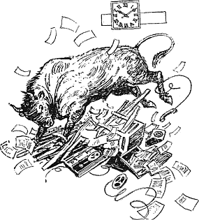 На выстрелы сбежались все находившиеся в здании и в изумлении остановились у порога, глядя на огромную тушу, лежавшую на полу кабинета. Никто не мог понять, как попал сюда бык.
