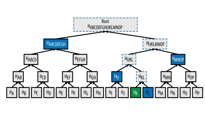 Теперь еще одна приятная особенность деревьев Merkle заключается в том, что в отличие от ранее рассмотренной цепочки блоков, если кто-то хочет доказать нам, что конкретный блок данных является членом этого дерева Merkle, все, что им нужно, это показать эти данные.