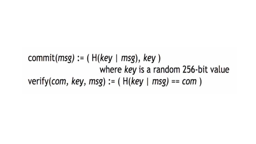И поэтому свойство сокрытия означает, что, если мы возьмем сообщение, и поставим перед ним что-то, что было выбрано из очень большого распределения, как в данном случае случайное 256-битное значение, тогда невозможно найти сообщение, как исходя из самого хэша, так и простым перебором возможных сообщений.