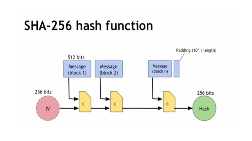 Прежде всего, хеш-функция может принимать любую строку любого размера как входной параметр. И хеш-функция производит вывод строки фиксированного размера, мы будем использовать 256 бит, потому что это делает биткойн.
