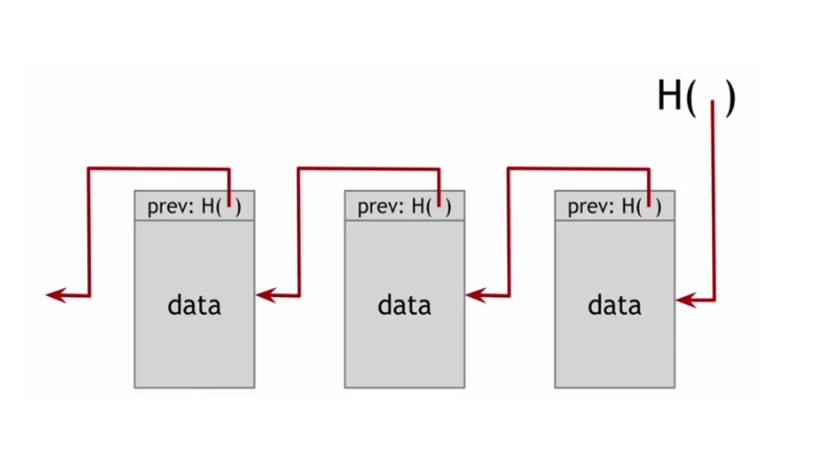 Так что, по сравнению с обычным связанным списком, где у вас есть серия блоков, и каждый блок имеет данные, а также указатель на предыдущий блок в списке, здесь указатель на предыдущий блок заменяется на хэш-указатель, который хранит указатель на предыдущий блок и хэш всего содержимого блока.
