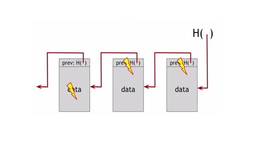 Например, здесь есть связанный список, который мы построили с помощью хэш-указателей.