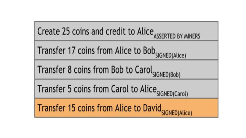 Транзакция будет содержать что-то вроде «мы передаем 17 монет от Алисы к Бобу», и эта транзакия будет подписана Алисой.