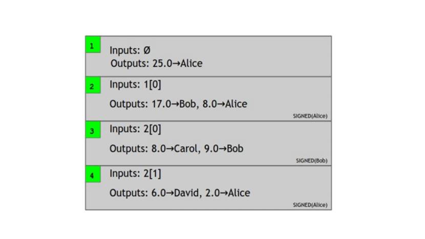 Для этого вам нужно будет просмотреть всю книгу назад во времени, чтобы увидеть каждую транзакцию, относящуюся к Алисе, и вычислить ее баланс на момент, когда она пытается передать 15 монет Дэвиду.
