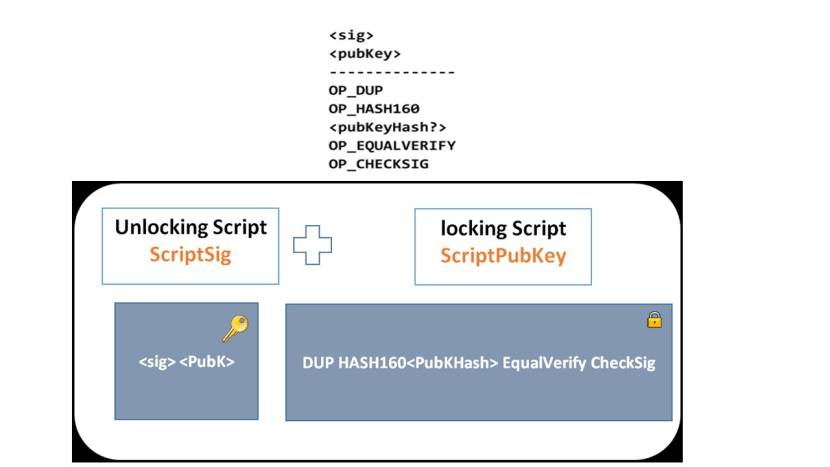 Эти два скрипта называются scriptPubKey и scriptSig, потому что в простейшем случае выходной скрипт просто указывает хэшированный публичный ключ или адрес, который может потребить этот выход транзакции, а входной скрипт следующей транзакции указывает подпись с этим публичным ключом.
