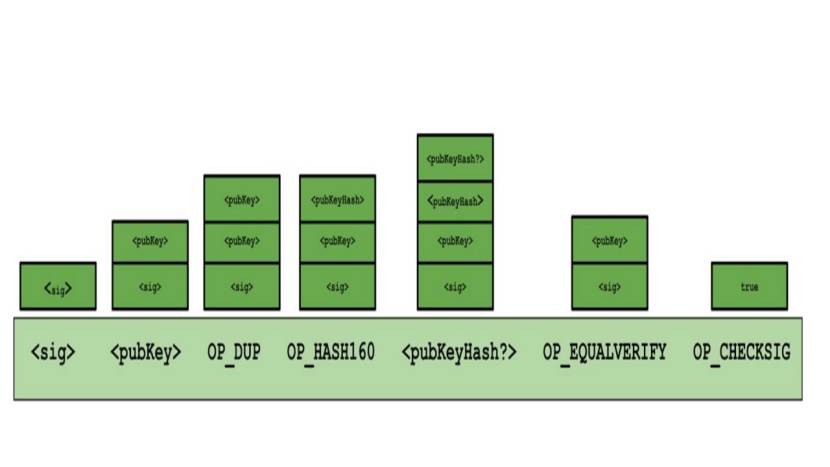 Таким образом, инструкция «CHECKSIG» выталкивает из стека два значения, открытый ключ и подпись, и проверяет, является ли эта подпись валидной для всей транзакции, используя этот публичный ключ.