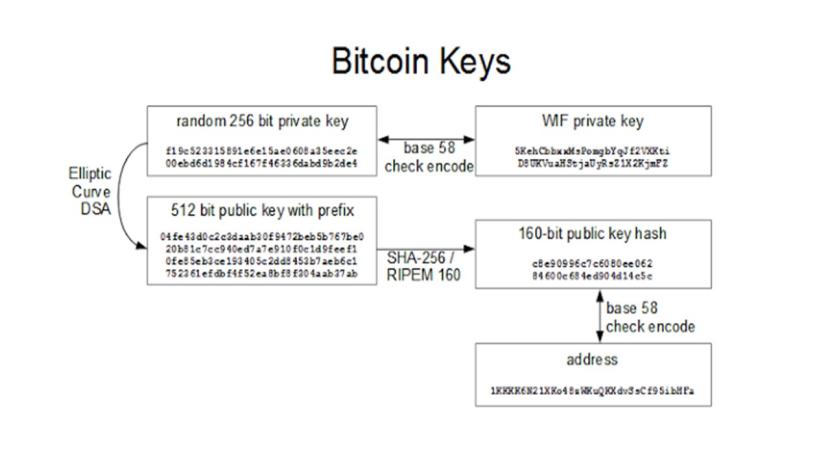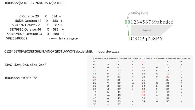Таким образом, чтобы закодировать адрес в виде текстовой строки, мы берем биты публичного ключа и преобразуем их из двоичного числа в число base 58.