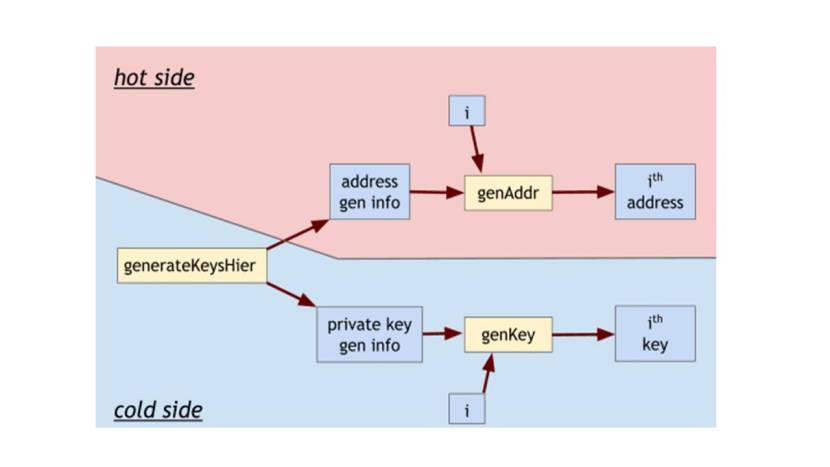 Чтобы иметь отдельное горячее и холодное хранилище, вам нужно иметь отдельные секретные ключи для каждого из них – иначе монеты в холодном хранилище будут уязвимы, если горячее хранилище будет взломано.
