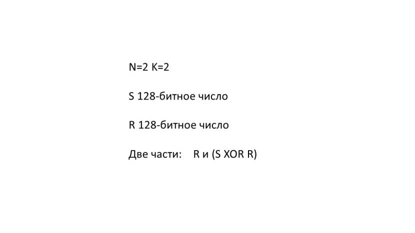 Этот трюк работает до тех пор, пока N и K будут одинаковыми – нам просто нужно будет генерировать N-1 разных случайных чисел R для первых N-1 частей, а последней частью будет секрет S – операция ИЛИ – со всеми остальными N- 1 частями.