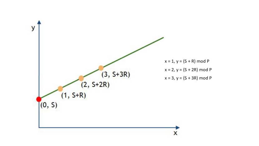 Секрет соответствует точке x = 0, y = (S + 0 * R) mod P, которая равна x = 0, y = S.