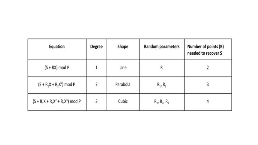 Мы хотим сделать это таким образом, чтобы, если мы получим какое-либо количество K этих частей, мы сможем восстановить оригинальный секрет, но, если нам дадут меньше, чем K частей, тогда мы не сможем узнать что-либо об оригинальном секрете.