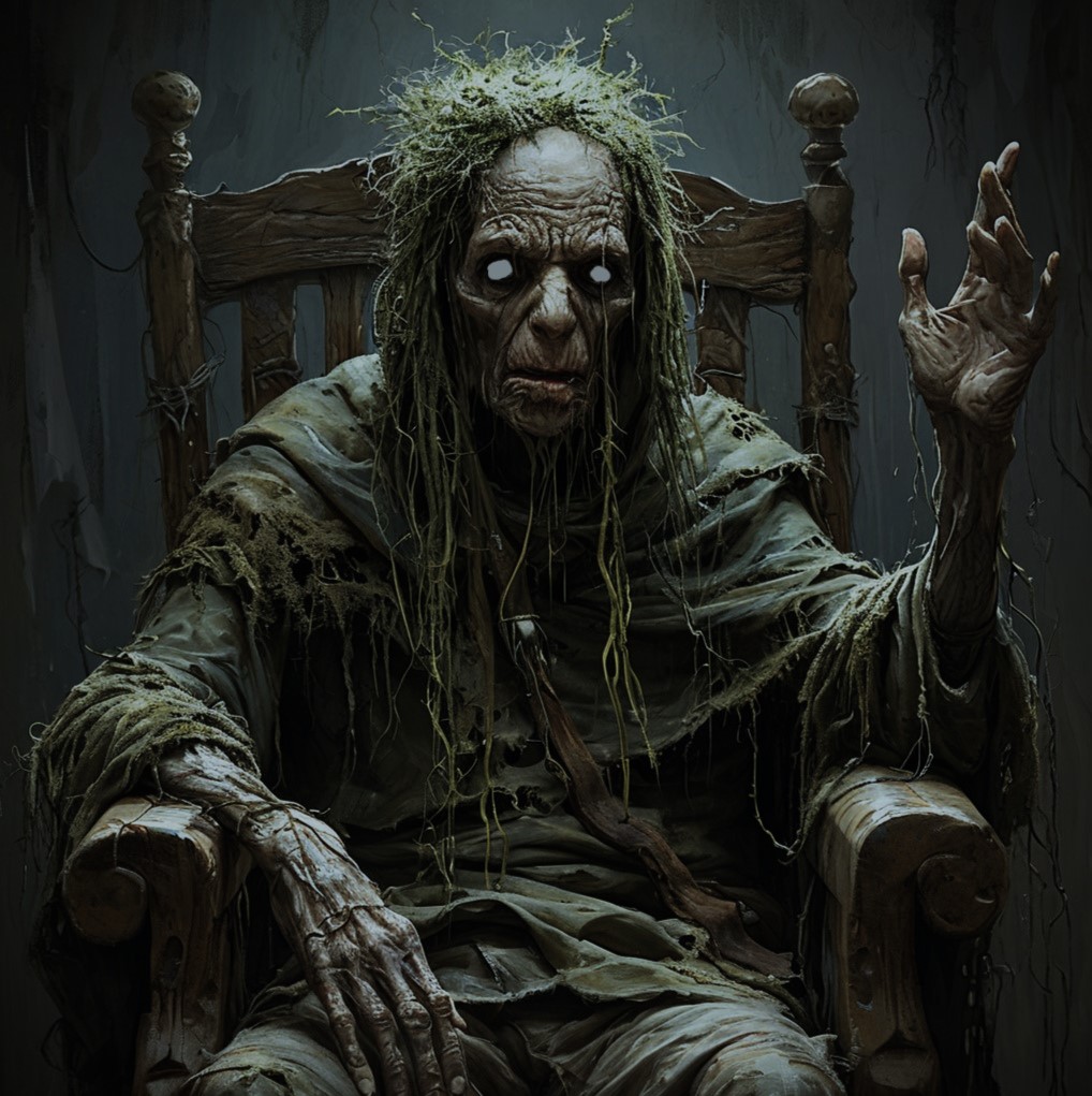 – Заходите, заходите. – Донесся из темной глубины голос, по сравнению с которым скрип и свист ржавых петель дверей показался бы прекрасной музыкой. – Раз пришли, проходите, не бойтесь, внутри моего дома вам ничего не грозит. – Гномы прошли вперед, скрипя половицами. Стены и потолок были увешаны сползающим мхом и паутиной. А трава, чем были утыканы щели между бревнами, торчала во все стороны. Здесь даже росли грибы, сквозь гнилые бревна и пол. В большом зале около сгнившего стола сидел существо, своим видом заставившее бы особо впечатлительного испустить дух. У гномов всего лишь кровь застыла в жилах, а по спине пробежал ощутимый мертвенный холодок. Существо, обросшее то ли камышом, то ли высохшими водорослями, сидело на каком-то подобии стула и разглядывало гостей пустыми блеклыми глазами. Его морщинистое лицо покойника было безмятежно, но рот, полный острых желто-зеленых зубов, слегка приоткрывался при дыхании. Существо вытащило свою руку, если ее можно было так назвать, из-под наряда из тины и слегка взмахнуло. Комната стала чуточку светлее и гномы смогли рассмотреть создание получше. Искаженные формы чудища не поддавались логике. Энруд, хоть и изучавший множество чудовищ, был слегка напуган с одной стороны ничтожностью тела существа, но с другой стороны огромной силой, коей оно обладало. Взгляд на нем было сложно задержать, как и на чем-либо, голова шла кругом. Все в этом доме было перекошено, перевернуто, приделано не под нужным углом. И первый вопрос, возникающий в голове каждого из путешественников, был о том, как это место еще не разрушилось.