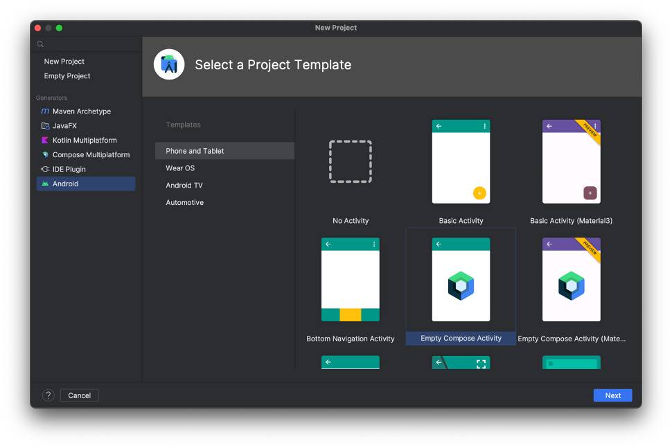 Процесс создания проекта схож со стандартным File – New – New project. Выберите Empty Compose Activity, далее укажите название проекта, пакет, версию Android и нажмите Finish. Обновите версии библиотек до последних версий.
