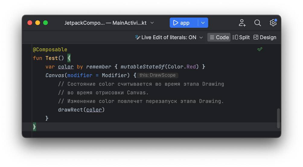 Чтение состояния внутри кода отрисовки влияет на этап Drawing. Распространенные примеры включают: Canvas, Modifier.drawBehind и Modifier.drawWithContent. Когда значение считанного на этом этапе состояния меняется, Compose UI запускает только этап Drawing.