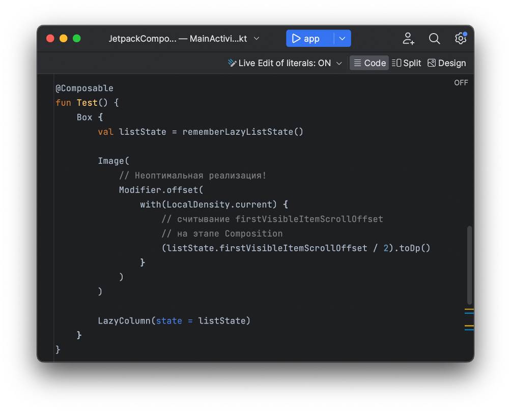В этом примере состояние читается внутри этапа Composition. Это необязательно плохо. Фактически – это основа рекомпозиции, позволяющая при изменении данных создавать новый UI. Причина не оптимальности кода в примере выше в том, что каждое событие скролла приводит к переоценке всего существующего composable-содержимого, и затем новому измерению, расположению и финальной отрисовке.