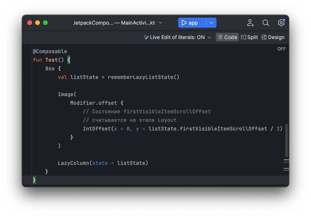 Почему этот способ более производительный? Лямбда, которую мы предоставляем модификатору, вызывается во время этапа Layout – если быть точнее, во время шага размещения – что означает, что наше состояние firstVisibleItemScrollOffset больше не считывается во время этапа Composition. Compose отслеживает, когда состояние считано. Поэтому, если значение firstVisibleItemScrollOffset меняется, Compose должен только перезапустить этапы Layout и Drawing.