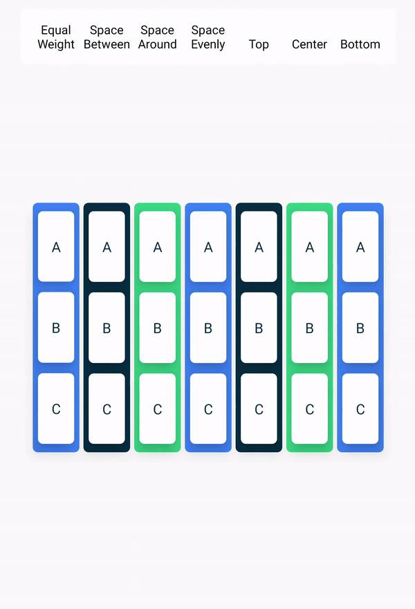 • Arrangement.SpaceBetween – компоненты распределяются по всей высоте с равномерными отступами между элементами, при этом первый и последний элементы прижимаются к границам контейнера;