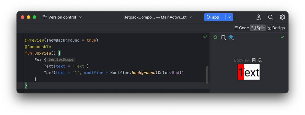 Box – аналог FrameLayout в XML. Нижний элемент будет отображаться поверх остальных, первый выполняет функцию подложки/фона.