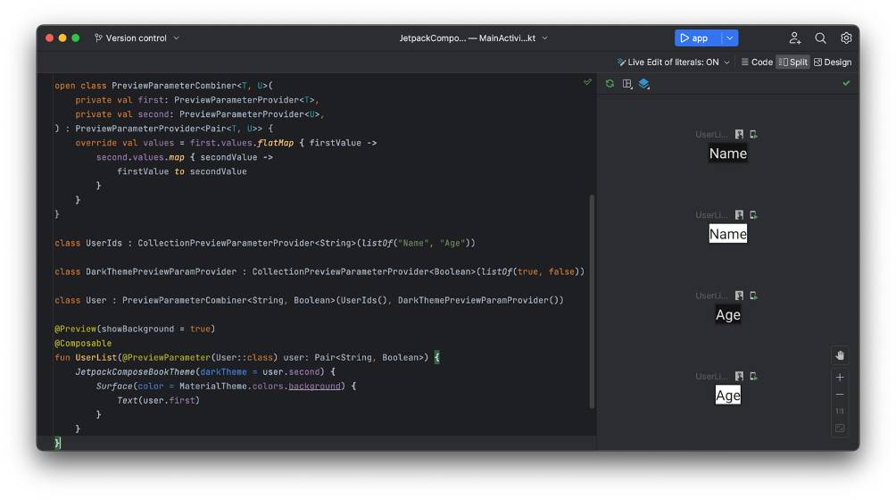 Несколько provider классов можно объединить в Pair при помощи класса обертки. В качестве provider классов можно использовать как CollectionPreviewParameterProvider, так и PreviewParameterProvider. Данный подход полезен, когда необходимо отобразить один и тот же mock в разном окружении, например в темной и светлой теме – и проанализировать – как элемент будет себя вести в каждой из них.