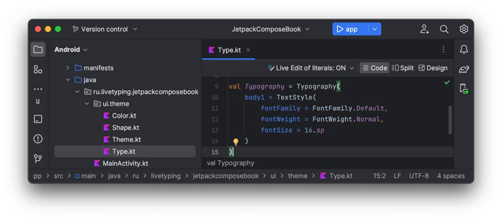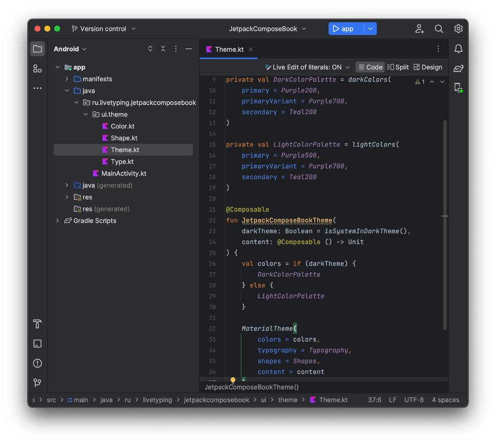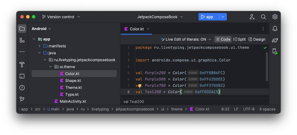 В отличии от проектов, где используется XML, вы не встретите пакета layout. Теперь весь интерфейс расположен внутри самого проекта. Помимо этого, Jetpack Compose предоставляет дополнительные файлы для стилей, шрифтов, тем. Первый файл в пакете ui.theme – Color. Внутри располагаются цвета, которые можно вызвать внутри интерфейса по их имени.