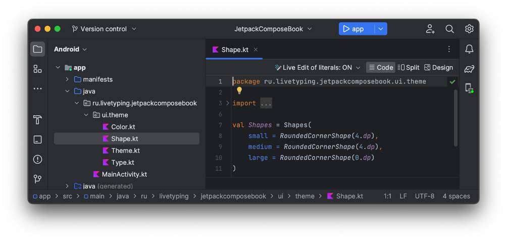 Второй файл – Shape. Для XML приложений часто приходилось создавать множество файлов с различными формами для элементов. В Jetpack Compose это располагается в одном месте и вам при этом необходимо передать внутрь только параметр, на сколько нужно закруглить View.