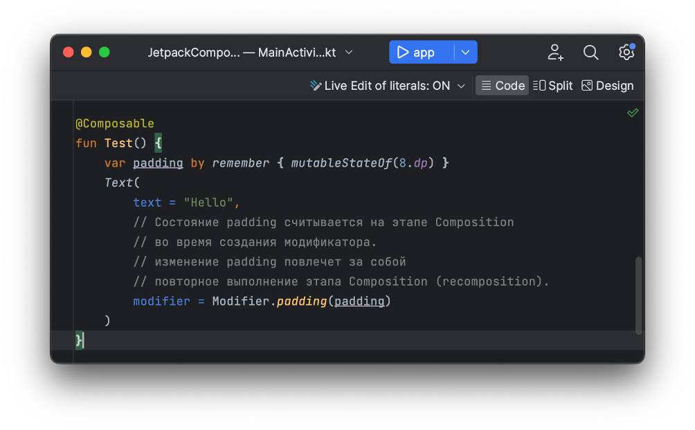 Оптимизация считывания состояния. Поскольку Compose выполняет отслеживание считывания состояний внутри этапов, мы можем минимизировать количество работы, выполняемой считыванием каждого состояния на этапах.