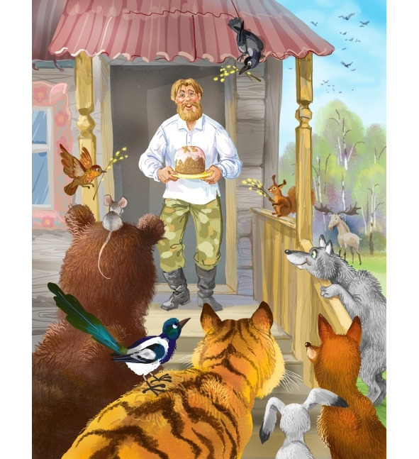 – Будет тебе куличик! – говорит батюшка. Пошёл в свою избушку и вынес большой румяный кулич, круглобокий да дивно пахнущий. – Вот, раздай своим зверям, да и сам не забудь кусочек съесть!