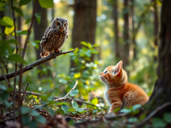 Призадумалась сова,Чуть похохлилась сперваПокрутила головойИ сказала: – Котик мой,Нет отваги у меня,Но у кошек есть родня,В смелости им равных нет —Поищи у них ответ.Что же делать, как же быть?Надо храбрость раздобыть!И подумавши немного,Он собрался в путь дорогу.За холмом еловый лес,Он сквозь ветки чуть пролез,Посмотрел немного ввысь —Прилегла на ветке рысь.
