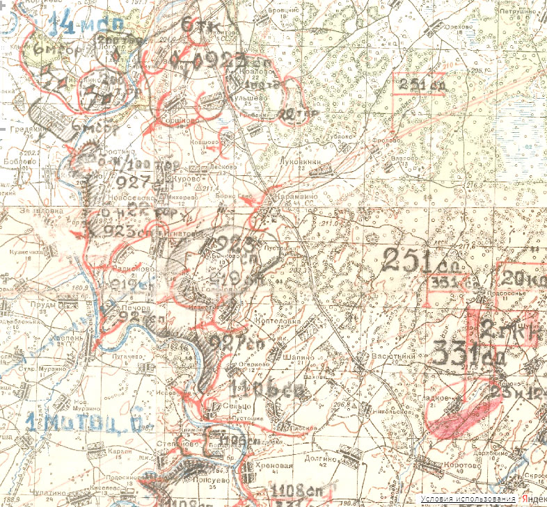 251сд – на Карамзино, Хлепень и далее овладеть Лапоток, Сидорово (севернее Сычевки).