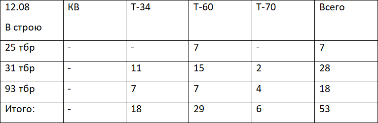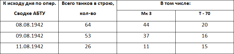 По оперативной сводке АБТУ 20А, в 188тбр, по состоянию на 08.08.1942., числилось танков в строю – 64, на 09.08.1942. – 53.