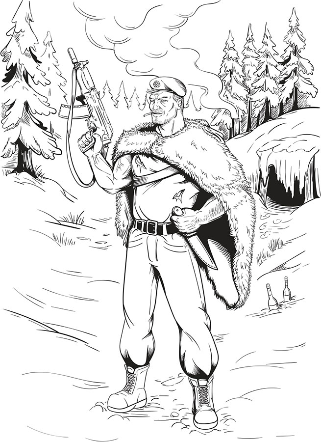 Наконец, занавес логова откинулся. Десантник сощурился от дневного света и, оторвав кусок мяса с кости, потянулся, расправляя могучие мышцы. Идеальная мишень. Но я же не собираюсь стрелять. Не прекращая жевать, он отошел в сторонку и принялся орошать девственный снег. «ВДВ» – разглядел я желтые буквы, которые выписывал Вован.