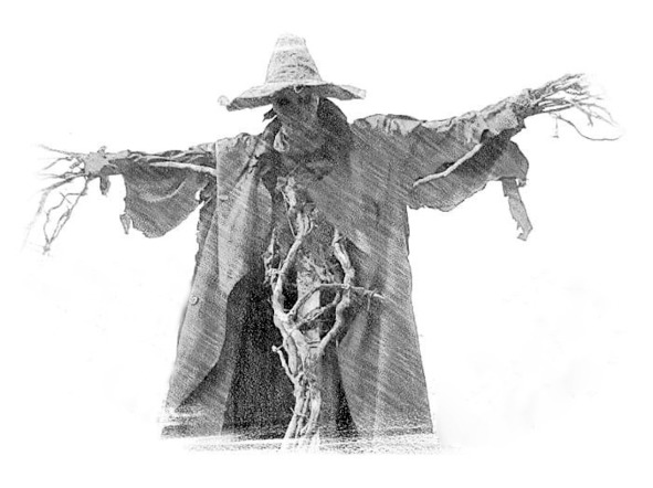 Полина впервые видела пугало. Девочка прибавила шаг и, опередив брата, первой подошла к столбу. Девочка подняла голову и увидела что сверху из старых веток и коряг сделано тело пугала. Поверх них был надет старый разодранный черный плащ. Голова была сделана из старого мачертетого мешка набитого соломой, а пугающие на вид глаза и рот были нарисованы черным углем или краской. На голове черная рваная шляпа.