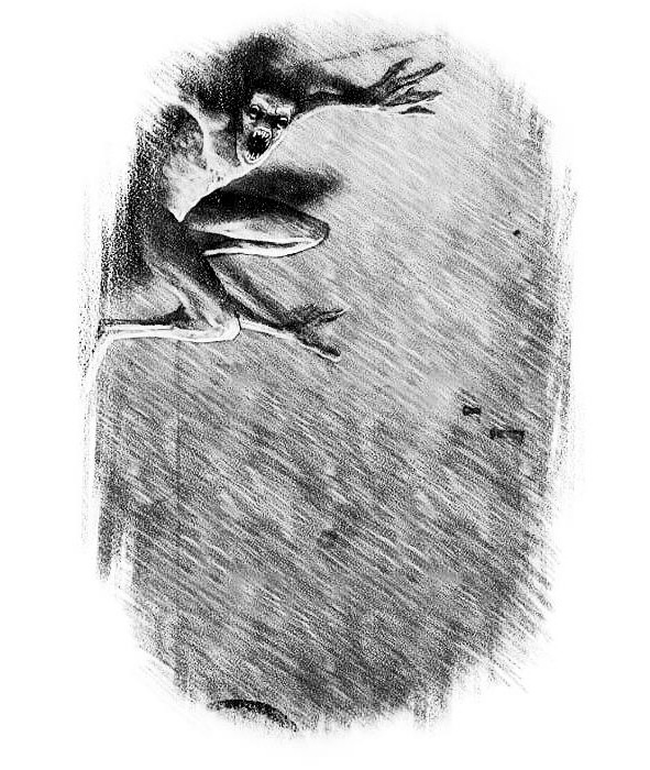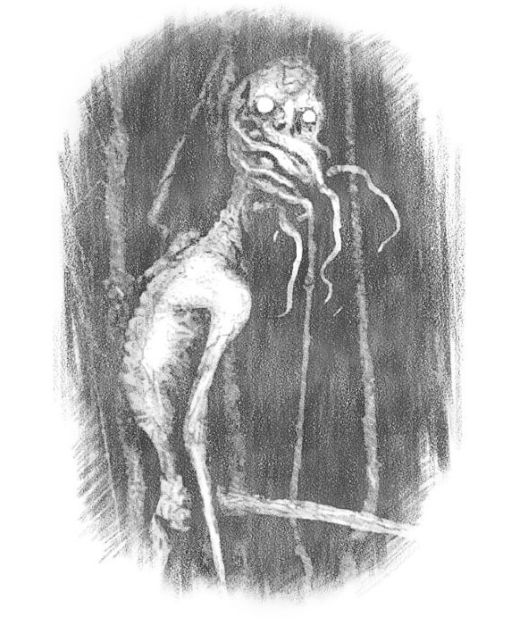 То, что он увидел, повергло его в такой шок и страх. В метре от него стоял высокий монстр. С виду это был человек, но это было нечто. Тело высохшее и сжатое, ребра деформированы и торчали в разные стороны. Ноги и руки были сплошные кости, обтянутые кожей. Палец так таковых не было, только две клешни. Голова больше тела, с большими белами глазами. Со щек выступали выросты на некое подобие щупалец осьминога.