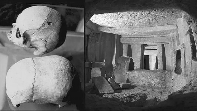 Крупнейший некрополь существ с вытянутыми черепами и небольшим ростом был обнаружен в Европе на острове Мальта. В 1902 году археологи изучали древний памятник Гипогей Хал-Сафлиени – пещерный город, вырезанный в скале более пяти тысяч лет назад. В одной из пещер ученые с удивлением для себя обнаружили захоронение примерно семи тысяч карликов с непропорционально вытянутыми черепами. При этом стены древнего акрополя украшали загадочные письмена с изображением геометрических фигур, спиралей и ряда таинственных знаков, дешифровать которые ученым пока не удалось. Можно сделать предположение, что это были записи неких технологий, которые данная раса разумных существ считала священными. В пещерах была найдена так называемая «комната Оракула», откуда шел ход в «украшенную комнату», также расписанную спиралями и таинственными знаками, а также высеченной из камня человеческой рукой. Но самой загадочной стала комната «Святая святых» с тремя каменными конструкциями, вставленными одна в другую, также неизвестного предназначения.