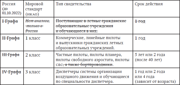 Из таблицы ниже можно понять, как графы соотносятся с классами. Например, частному пилоту – второй класс и третья графа.