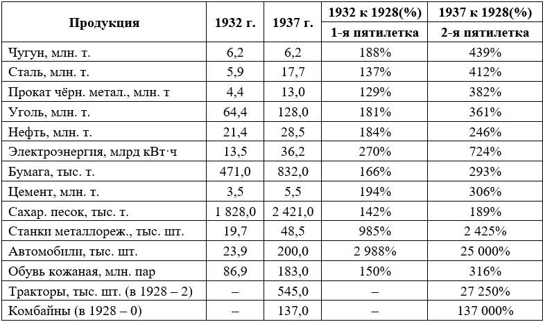 Рост физического объёма валовой продукции промышленности СССР в годы 1-й и 2-й пятилеток ярко характеризуют цифры, приведенные ниже: