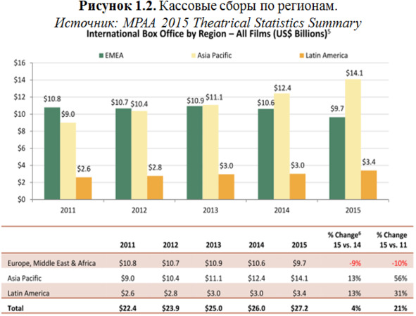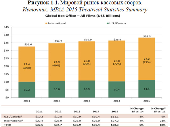 Согласно данным статистического отчета американской ассоциации кинопроизводителей (MPAA, 2015). мировой бокс-офис в 2015 году вырос на 5% в сравнении с 2014 годом, при этом, темпы роста самого крупного североамериканского рынка в два раза превысили темпы роста международного (в американском представлении) рынка. Данные приведены на рисунке 1.1.