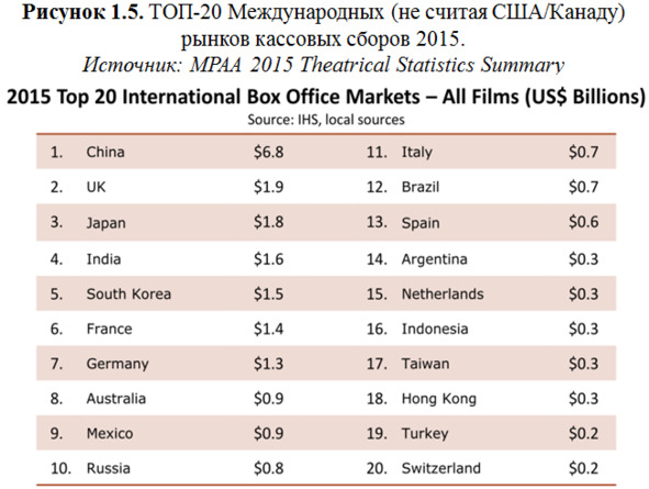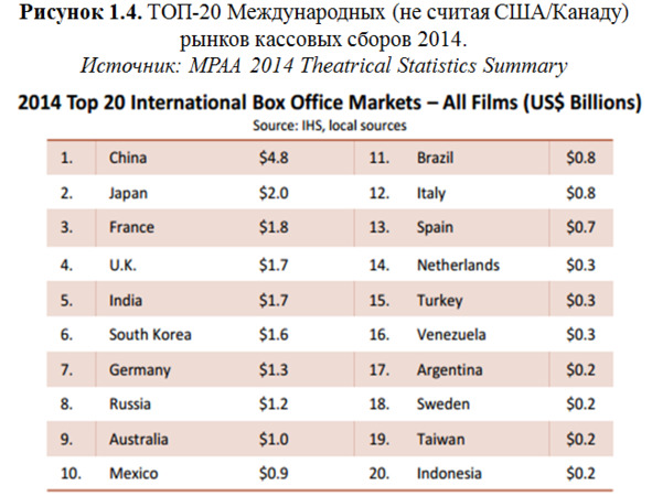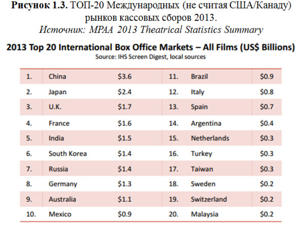 На рисунках 1.3 – 1.5, приведенных ниже данные ежегодных отчетов МРАА по кассовым сборам на международных рынках. (MPAA, 2013) (MPAA, 2014) (MPAA, 2015). Как видно – четыре из пяти лидеров (не считая североамериканский рынок) по объему кассовых сборов являются представителями азиатского региона – это Китай, Япония, Индия и Южная Корея. Основным драйвером азиатского кинорынка, несомненно, является Китай, демонстрирующий фантастические темпы роста.