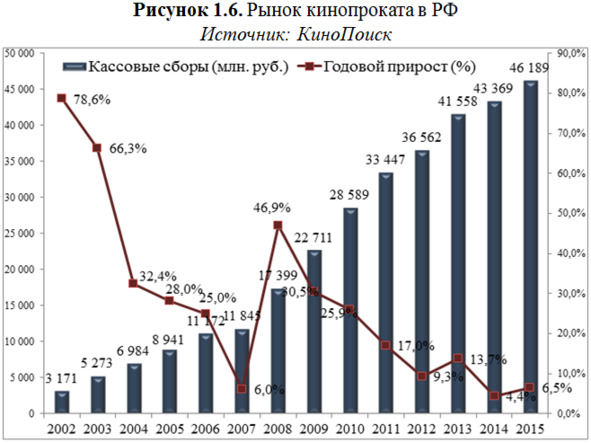 Рост посещаемости кинотеатров начался после 2000-х годов: в 2002 году количество посещений кинотеатров на душу населения составляло 0,28. Развитие экономики России, рост таких ключевых показателей, как ВВП и средний доход на душу населения, оказали положительное влияние и на киноиндустрию. Строительство большого количества торгово-развлекательных центров влекло за собой увеличение числа экранов кинотеатров в нашей стране, что, в свою очередь, способствовало увеличению инвестиций в кинопроизводство (Пичугин, 2009). К концу 2005 года отечественный кинорынок находился на необычайном подъеме, рынок кинопроката демонстрировал темпы роста в 20—30% годовых, ставя все новые рекорды кассовых сборов, что не могло остаться незамеченным со стороны крупных отечественных инвесторов9. Показатели отечественного кинорынка отражены на рисунке 1.6 и в таблице 1.1.