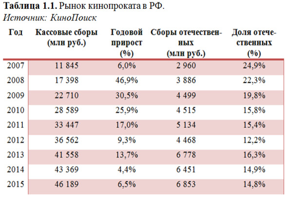 Во времена СССР киноиндустрия находилась на передовых позициях по части наполнения бюджета. Бывший зампред Госкино СССР Борис Павленок в интервью изданию «Коммерсант. Власть», говоря о рентабельности советского кинематографа, приводит цифру 900% годовых8. Советский Союз являлся одним из лидеров по посещаемости кинотеатров: так, в 1970-х годах посещаемость кинотеатров находилась на уровне 4 миллиардов посещений в год, в те годы функционировало более пяти тысяч кинотеатров. В 1986 году было продано 4 миллиарда билетов по средней цене в 33 копейки, что принесло 1,33 миллиарда рублей (Пичугин, 2009).