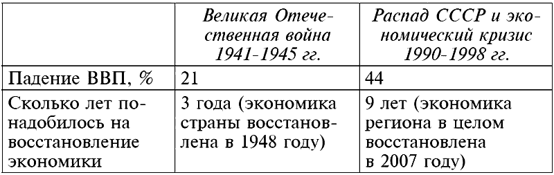 Экономический ущерб начавшегося с распадом Советского Союза кризиса в относительном выражении более чем в два раза превысил урон народного хозяйства страны в результате Великой Отечественной войны, а на восстановление экономики понадобилось втрое больше времени, чем в послевоенный период (табл. 1).