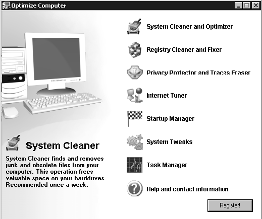 Рассмотрим модули программы подробнее. Утилита System Cleaner and Optimizer находит старые и неиспользуемые файлы и удаляет их, в результате чего освобождается место на жестком диске и ускоряется работа компьютера в целом. Модуль Registry Cleaner and Fixer предназначен для исправления ошибок в реестре Windows, удаления неиспользуемых модулей и дефрагментации жесткого диска. Утилита Privacy Protector and Traces Eraser позволяет удалить все следы пребывания в Интернете, а именно файлы Сookies, адреса посещенных вами интернет-страниц, файлы истории. Модуль Internet Tuner содержит 11 настроек, благодаря которым можно достичь максимальной скорости интернет-соединения. Утилита Startup Manager отображает программы, которые загружаются вместе с Windows. Модуль System Tweaks позволяет выполнить тонкую настройку системы. Модуль Task Manager отображает все задания и процессы, которые запущены в системе. Вы можете остановить ненужные одним щелчком мыши, увеличив тем самым быстродействие системы.