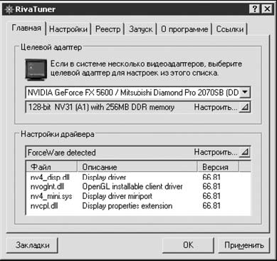 Эта программа (рис. 1.11) пользуется огромной популярностью среди владельцев видеокарт на базе чипов NVIDIA. По большому счету, RivaTuner можно использовать для любой другой видеокарты, однако многие параметры при этом будут недоступны.