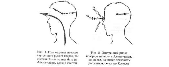 Поэтому активизируем в себе ощущения, связанные с управлением потоками. Начнем с восходящего потока. Сядьте или встаньте прямо, отбросьте мысли, сосредоточьтесь только на ощущениях внутри своего тела. Уловите перед позвоночником движение энергии снизу вверх -от первой чакры ко второй, затем к третьей и так до седьмой. Поток выходит из Земли и, проходя сквозь ваше тело, через макушку головы устремляется вертикально вверх, в глубины Космоса. Начинайте делать вдохи и выдохи – ощутите, как при вдохе поток активизируется, становится сильнее, как вы при помощи вдоха можете сделать поток интенсивнее. Когда ощущение движения потока станет ясным и четким, представьте себе, что в центре вашей головы укреплена стрелка, которую вы по своей воле можете поворачивать в любую сторону, – что-то вроде флюгера. Поверните ее вперед. Вы почувствуете, как поток, устремляясь вверх, доходит до верхних чакр и начинает выплескиваться наружу, направляясь вперед, из области примерно между бровями, из Аджна-чакры.