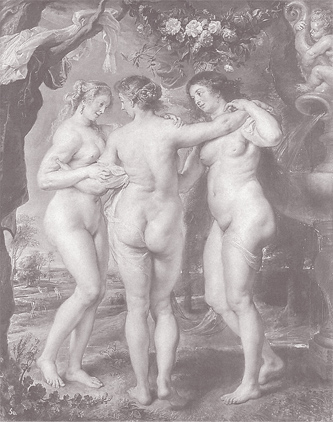 Сегодняшнего обывателя раздражает или смешит полнота рубенсовских граций и вакхов, переходящая, на современный взгляд, всякие границы «изящества» (илл. 2). И верно, в сравнении даже с другими грациями, Венерами и куртизанками эпохи Возрождения и барокко, от Джорджоне до Бернини и Веласкеса, рубенсовские обнаженные являют настоящее буйство плоти. Но что это буйство значило для мастера и для его современников? Историк искусства объяснит, что суть дела – в изменении отношения к рисунку, к противостоянию линии и пятна, то есть графичности и живописности как основ стиля. Для Рафаэля в начале XVI века важнее контур, для Рубенса и Рембрандта – передача всех нюансов человеческой плоти с помощью кисти и краски. Рафаэлевские грации (1504–1505) прелестны, но лишь касаются друг друга, смотрят в разные стороны, сохраняя самодостаточность и статуарное достоинство античной модели, художнику хорошо знакомой. Они одновременно едины и неслиянны (илл. 3). Рубенс, видевший эту небольшую картину в римской коллекции кардинала Боргезе, сознательно «ответил» великому предшественнику – и вдохнул в старинную иконографическую схему совершенно новую жизнь. Если приглядеться к каждой детали его полотна, то понимаешь, как глубоко художник изучил анатомию тела. Представим на секунду на месте его героинь властительниц наших подиумов и поймем, что картина, как говорят искусствоведы, развалится. Буше, Энгр, Делакруа, Кустодиев, Майоль, Ренуар хорошо усвоили этот урок Рубенса и барокко. И не только они.