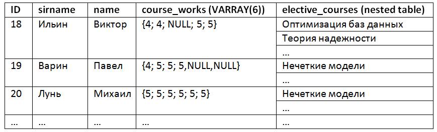 Пусть есть таблица students со сведениями о студентах, у которой первые три столбца имеют скалярные типы данных, а столбцы course_works (курсовые работы) и elective_courses (факультативы) объявлены как массив переменной длины и вложенная таблица.