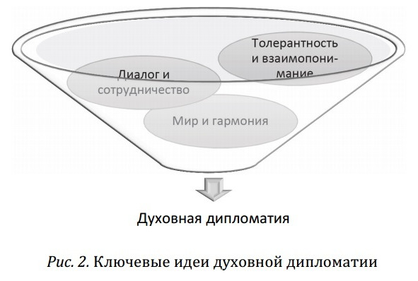 Ключевые идеи духовной дипломатии – это толерантность и взаимопонимание, диалог и сотрудничество, мир и гармония (рис. 2). Духовная дипломатия основывается на принципах уважения к образу жизни, истории и многообразии традиций, терпимости и мирного сосуществования разных культур, религий и наций, которые составляют нравственные начала жизни. Устремления духовной на мирное сотрудничество и содействие продвижению ценностей толерантности, способствует развитию взаимопонимания, укреплению доверия и созданию атмосферы, мира и согласия сотрудничества между государствами и народами.