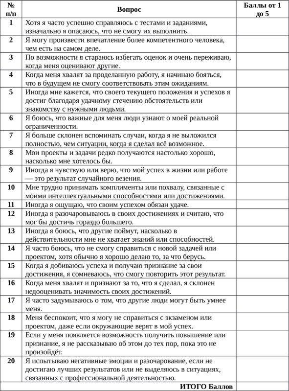 – 40 баллов или менее – низкая степень проявления синдрома самозванца;