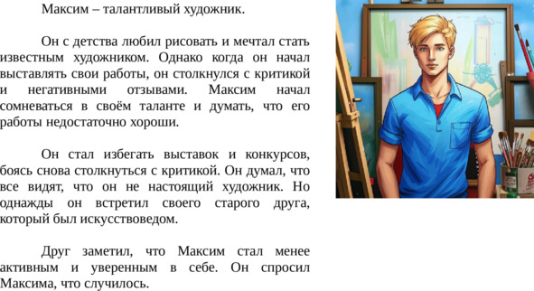 Максим рассказал другу о том, что он чувствует себя никчёмным и считает, что его работы никому не интересны. Друг поддержал Максима и посоветовал ему обратиться к психологу. Психолог помог Максиму понять, что критика и негативные отзывы – это часть творческого процесса. Он научил Максима принимать критику и использовать её для развития своего таланта.