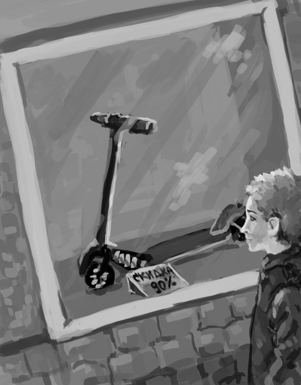 Я плачу уже два дня, и меня даже никто не успокаивает, ведь для взрослых это незначительно. А все началось 2 дня назад из-за того, что я увидел на витрине магазина новый неоновый самокат с подсветкой на руле и колесах. Я, понятно, захотел этот самокат и сказал об этом родителям, ведь я знал и видел, что они получили зарплату именно сегодня. И что вы думаете мне ответили? Конечно же, то, что у них нет денег. А этот самокат как раз был не особо дорогим, ведь он последний день стоял на витрине со скидкой 90%. Когда мне отказали, я был в ужасном гневе и с обидой на родителей.